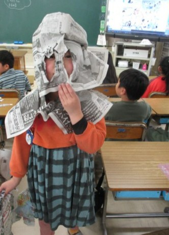 2年生が図工で「しんぶんしと なかよし」の学習をしていました。