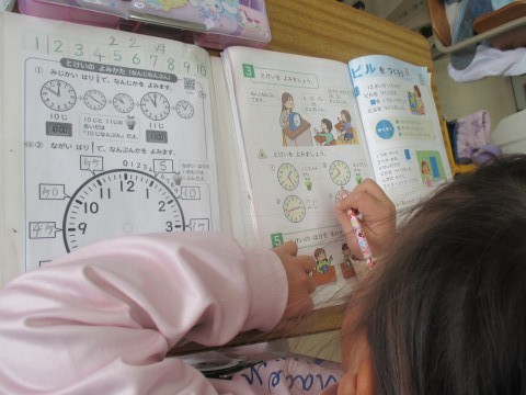 「何時」と「何時半」の時間をよむ練習をしていました。