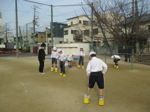 先日の出前授業で,地域の方からいろいろな昔の遊びを教えていただいた1年生。