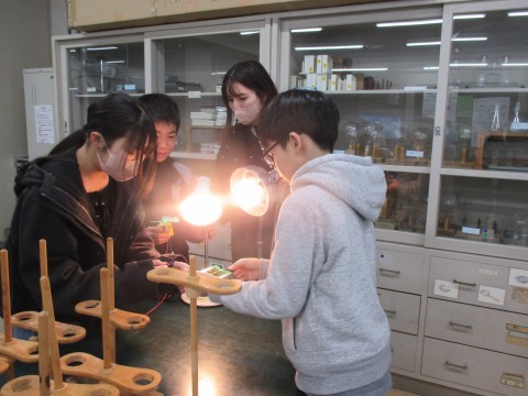 今日は光電池にモーターをつなぎ強い光を当てるとどうなるか実験をしていました。