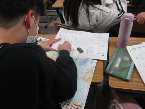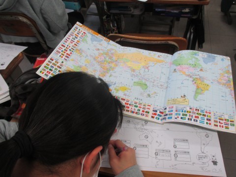6年生が社会の時間に,世界地図にさまざまな国の名前を書き込んでいました。