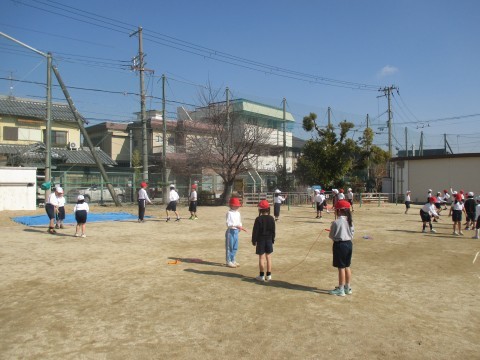 1年生が体育の時間に3人一組でなわとびをしていました。