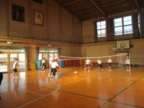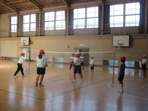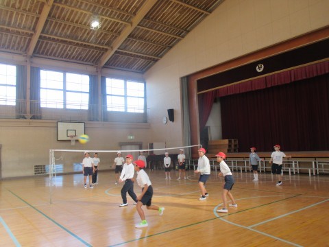 4年生が体育館の体育で「バウンドキャッチ バレーボール」をしていました。