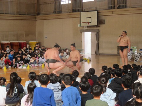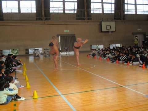 今日は,大鳥大社の方と荒汐部屋の力士の方に来校いただき