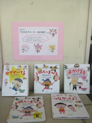 3年生のフロアに,「いのちのまつり」のシリーズの本を集めた