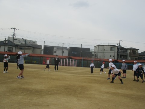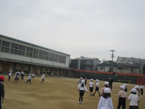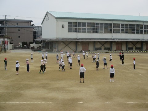 1年生が運動場でドッジボールをしていました。