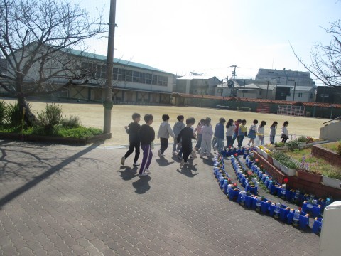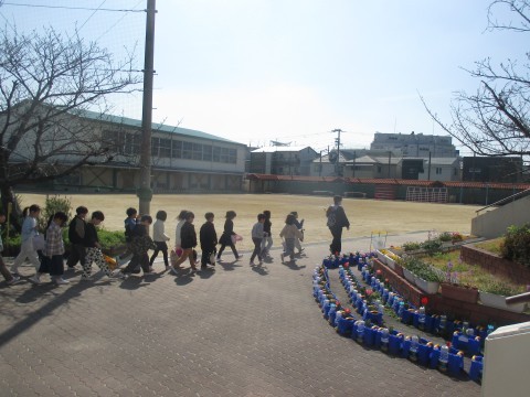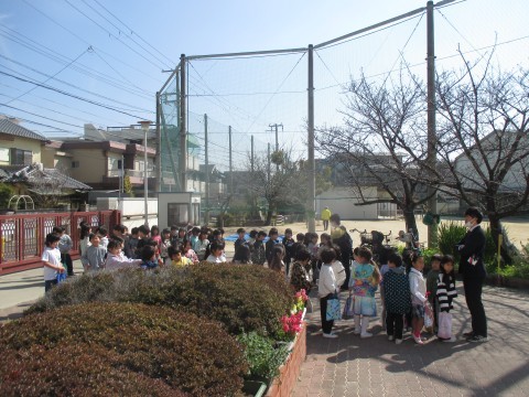 修了式・離任式のあと,1年生は校門のところへ移動し,