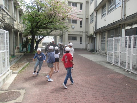 休み時間,中庭で大なわをしたり,なわとびをしたりしている児童がいました。