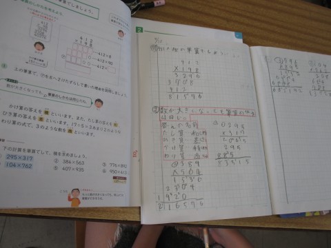 4年生が算数の時間に,かけ算の筆算の学習をしていました。
