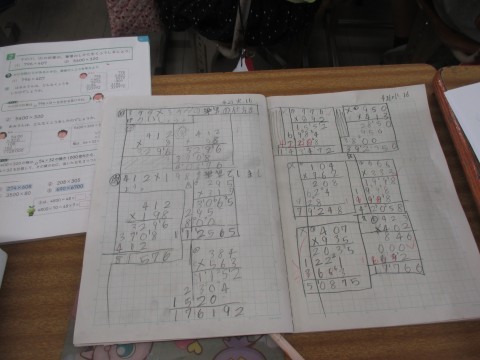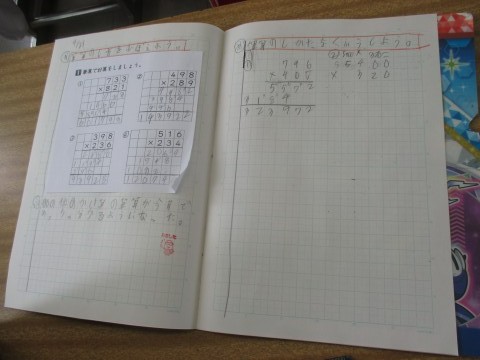 4年生は算数で,かけ算のひっ算の学習をしています。