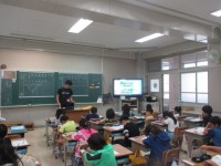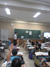 3組の生活科です。学校探検で見つけたものについて話し合っています。