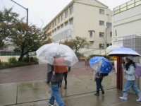 小雨が降っていて寒い朝です。子どもたちは,色とりどりの傘やレインコートで登校して...