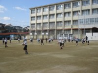 1年生が運動場でサッカーをしていました。うまく相手のところにボールを蹴るのはなか...