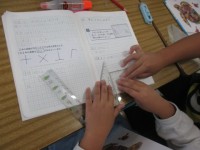 4年生が,平行な直線の特徴について学習していました。ノートにかいた平行な直線を使...