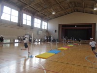 6年生は体育館の体育で,走り高跳びの学習をしています。リズミカルな助走から力強く...