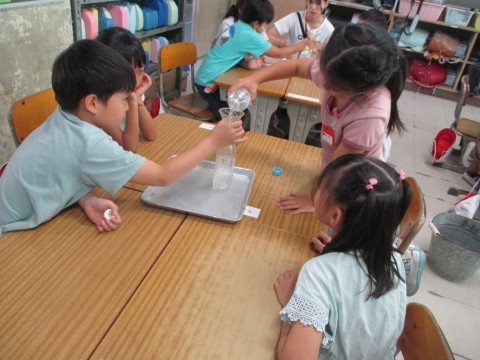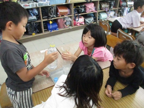 どちらのペットボトルがたくさん入るのか、水を入れて実験しました。