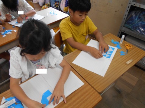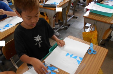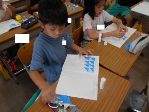 算数の授業で三角形をしきつめました。いろいろな模様を作って楽しく学べました。
