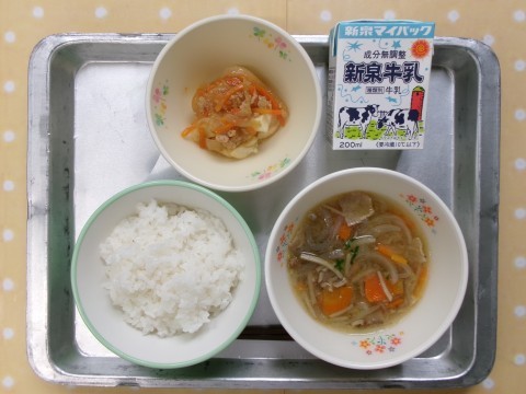 今日の給食は「ご飯,牛乳、豚汁,揚げじゃがのそぼろかけ」でした。揚げじゃがのそぼろかけは素揚げにしたじゃがいもに,水溶き片栗粉でとろみをつけたあんがかかっています。「これ好き♪」とよく食べていました。