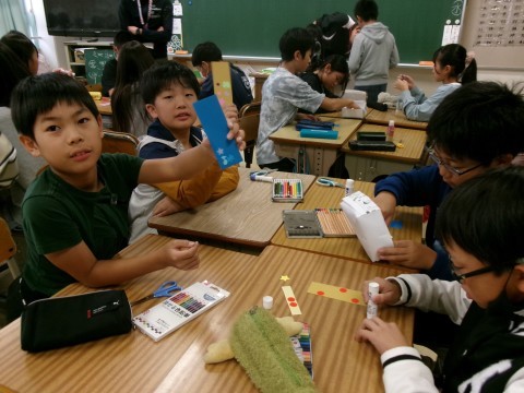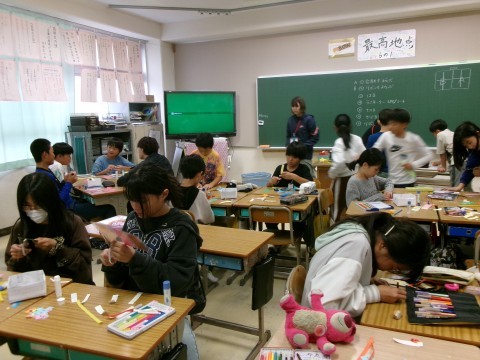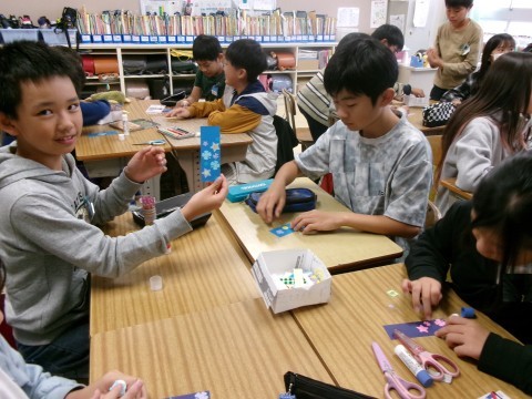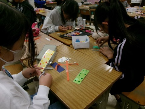 給食委員会活動の様子です。給食がんばりカード表彰時に渡す「しおり」を作成しました。色画用紙に,型抜きの模様を乗せたりシールを貼ったり,楽しそうです。素敵なしおりがたくさんできました。