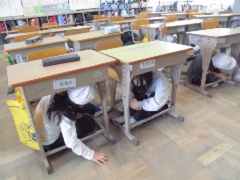 子どもたちは、地震発生時に自分の身を守るための行動として、すばやく机の下に隠れる練習をしました。