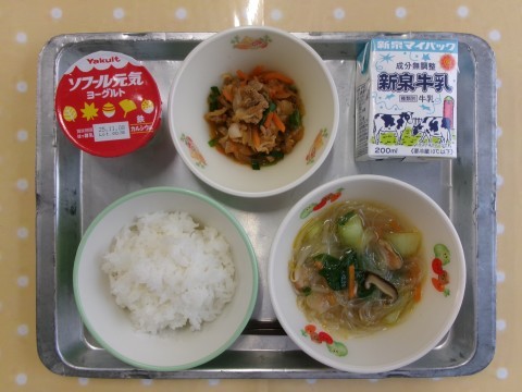 献立は「ご飯,牛乳、春雨スープ,スタミナ丼,ヨーグルト」でした。スープのうま味をたっぷり吸った春雨スープは人気です。しょうがのさわやかな風味が味をよくしました。