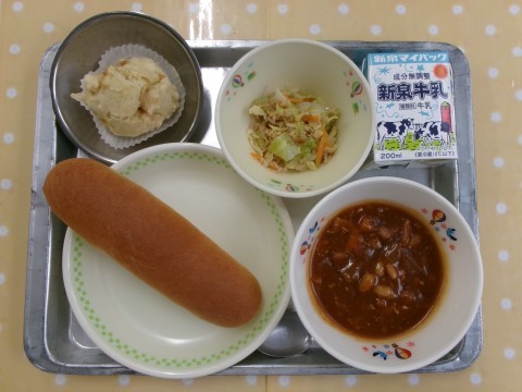 献立は「ミニコッペパン,牛乳、ポークビーンズ,ツナとキャベツのソテー,コーンブレッド」でした。コーンブレッドは,堺市と姉妹都市のアメリカ,バークレー市の家庭料理です。とうもろこしの粉をつかってつくるパンのようなものです。