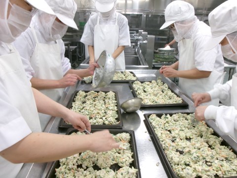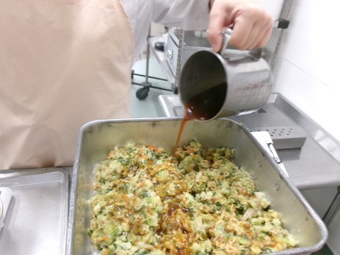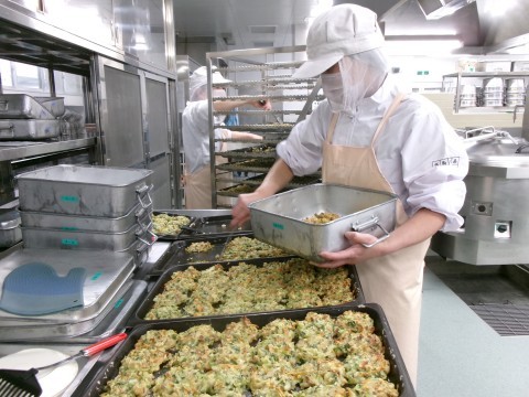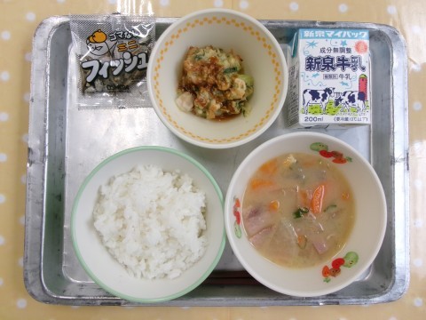 献立は「ご飯,牛乳、豚汁,小松菜のお好み焼き,ミニフィッシュ」でした。11月8日は「いい歯の日」です。歯を丈夫にするカルシウムを多く含む「小松菜のお好み焼き」と「ミニフィッシュ」を食べました。