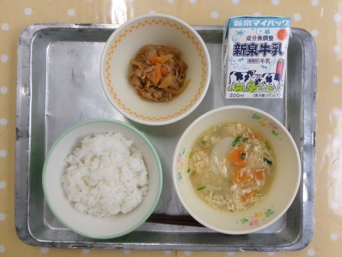 献立は「ご飯,牛乳、トック,豚肉のプルコギ」でした。トックは,うるち米からつくられた韓国のおもちです。スープの中でやわらかくなったトックは食べやすいです。