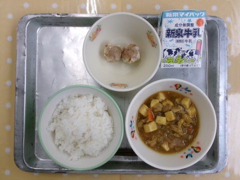 献立は「ご飯,牛乳、カレー豆腐,焼きシューマイ」でした。カレー豆腐は,マーボー豆腐の味つけをカレー味にしたような料理で,ご飯によく合うおかずです。スパイスの香りが食欲をそそります。