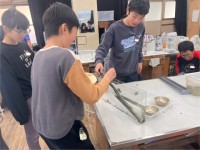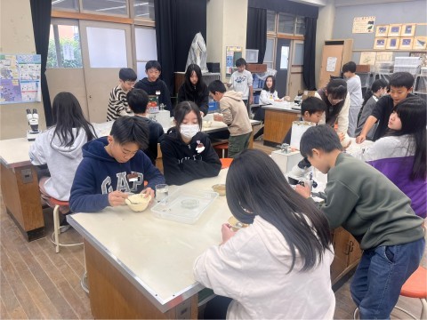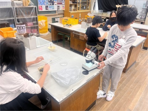 火山から出てくるもので作った園芸用の土(鹿沼土)と砂を観察して比べています。