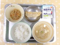 献立は「ご飯,牛乳、ほうとう,ひじきの甘煮,小魚の佃煮」でした。ほうとうは山梨県の郷土料理です。小麦粉を練り平らに切った「ほうとう麺」を,かぼちゃやはくさい・しゅんぎくなどの具材と一緒に,みそ味で煮込みました。1年生から6年生まで「おいしい♪おいしい♪」と大好評でした。