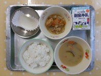 献立は「ご飯,牛乳、むらくも汁,さばのごまみそ焼き,キャベツと小松菜の炒め煮」でした。「むらくも」とは空に群がる雲を表しています。卵が汁の中に薄く広がった様子が「むらくも」のように見えることからこの名前がついたと言われています。