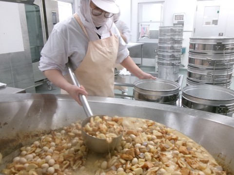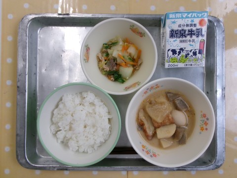 献立は「ご飯,牛乳、みそおでん,大阪しろ菜と豚肉の煮びたし」でした。赤みそと白みそで味をつけたおでんを食べました。大根と里芋がやわらかく煮えて味がしみ込みました。