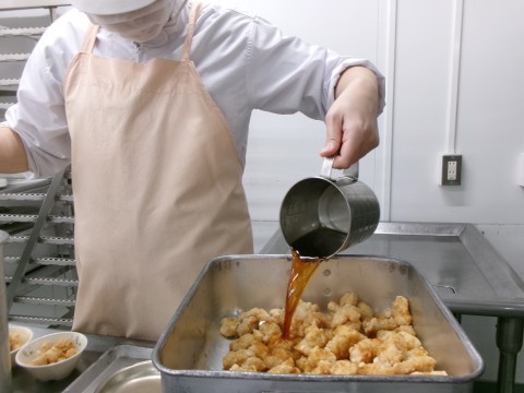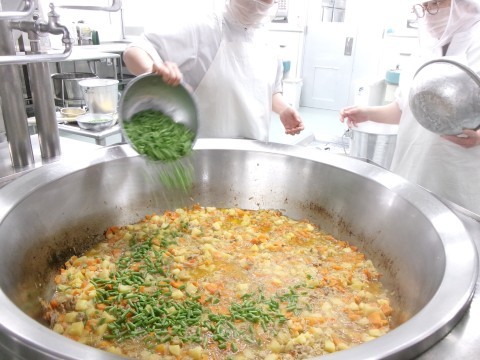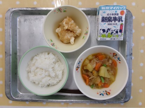 献立は「ご飯,牛乳、肉じゃが,チキン南蛮」でした。削り節でとった出汁で炊いた肉じゃがは,ほくほくに煮えたじゃがいもに味が染みておいしいです。三度豆を入れて彩りよくしあげました。