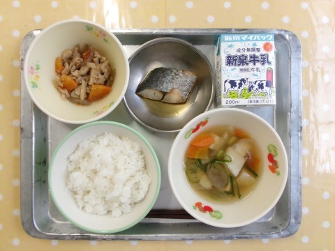 冬至献立は「ご飯,牛乳、けんちん汁,さわらの幽庵焼き,れんこんのきんぴら」でした。22日は冬至です。給食では,運を呼び込める『ん』の付く食べ物「れんこん」と「にんじん」を食べました。