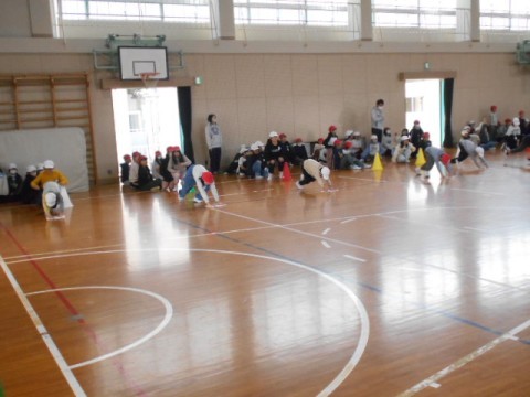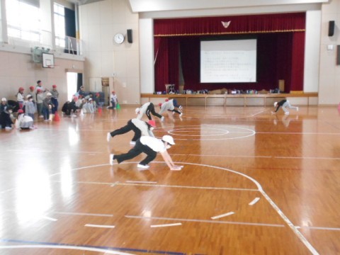 クラス対抗で王様ドッジとぞうきんがけレースをしました。