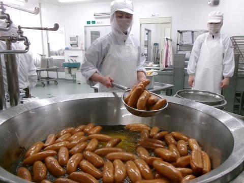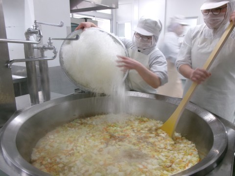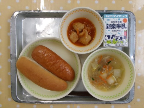 献立は「牛乳、ミニパン・揚げパン,春雨とうずら卵のスープ,肉団子のケチャップ煮」でした。お楽しみの揚げパンは,今日も上手にできました。中はふんわり外はカリッと色よく揚げたら,グラニュー糖をまぶしてできあがりです。