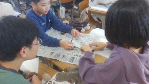 実際の新聞を見て,新聞にはどんな内容が書いてあるのかを確認する活動も行いました。