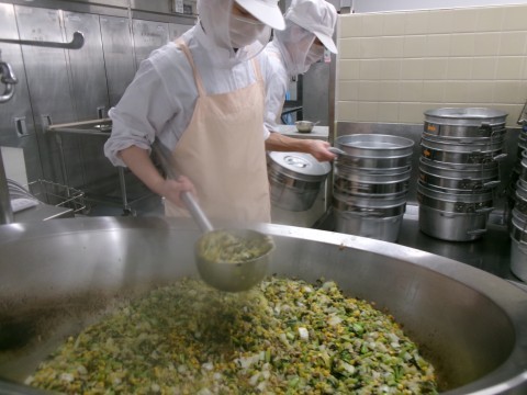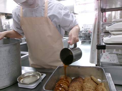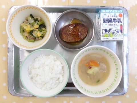 献立は「ご飯,牛乳、さつま汁,照り焼きハンバーグ,小松菜とはくさいの炒め煮」でした。照り焼きハンバーグは人気です。人気の秘密はソースです。「照り焼きソースがおいしい♪」「ご飯とよく合うから好き♪」だそうです。