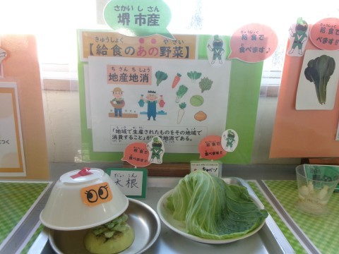 堺市産の大根は「おでん」に,堺市産のキャベツは「野菜のごま酢」に入っていました。給食では地産地消に取り組んでいます。