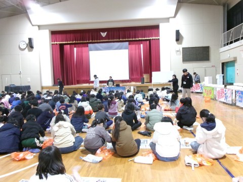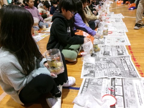 和歌山の特産品である野菜(豆)と果物(梅)の栽培方法や歴史,食べ方についてのお話を聞いた後,梅ジュースづくりと豆むきを教えていただきました。