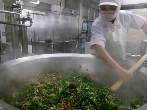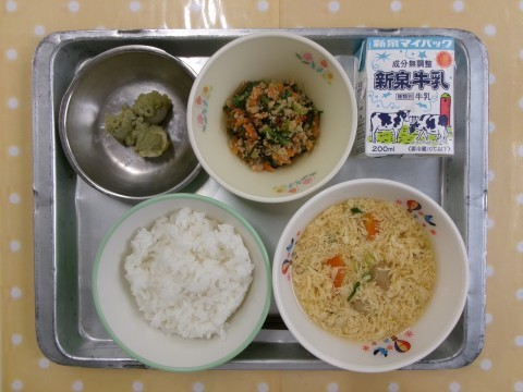献立は「ご飯,牛乳、むらくも汁,かむかむ堺っ子丼,くるみもち」でした。2月の食育目標は「堺のめぐみについて知ろう」です。かむかむ堺っ子丼には,堺のめぐみの「小松菜」と堺にゆかりのある食材「昆布」がはいっています。「ご飯に混ぜて食べたらおいしい~♪」と3年生。くるみもちは,裏ごし大豆でつくった「あん」でお餅をくるんでいます。食べたことあったかな?