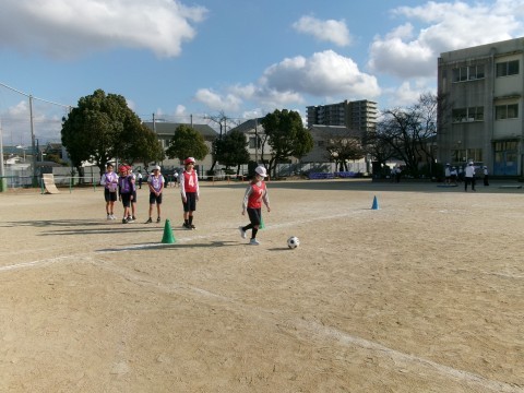 外体育のサッカーの様子です。学級会で決めたチームで頑張っています。