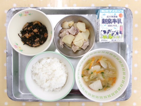 献立は「ご飯,牛乳、野菜たっぷりすまし汁,豚肉のみそマヨガーリック焼き,ひじきの甘煮」でした。「ひじきおいしい♪」と5年生。ご飯によく合うおかずは人気があります。