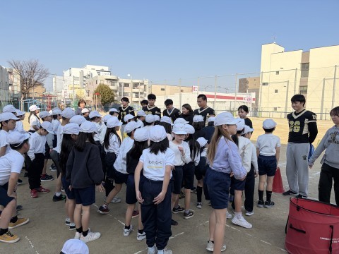 最後は試合形式で子供たちと大学生が一緒に作戦を立て,攻めと守りに分かれ,試合をしました。