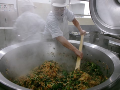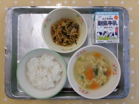 献立は「ご飯,牛乳、トック,ビビンバ風」でした。旬のほうれん草を入れてビビンバをつくりました。切干大根と大豆もやしも入っていました。「わかったで,大豆もやし入ってるやろ~♪」と3年生。すがたをかえる大豆の授業で「大豆もやし」を勉強した3年生。すぐに気がついたそうです。