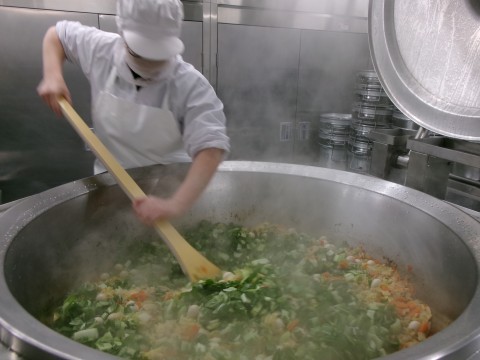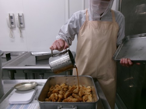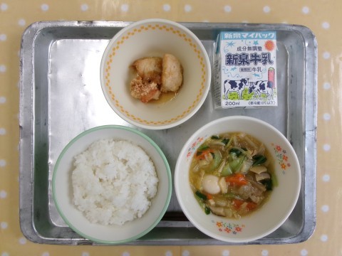 献立は「ご飯,牛乳、八宝菜,ユーリンチー」でした。八宝菜は,ちんげん菜の他に10種類の材料がはいっています。具だくさんですが,食べやすいおかずです。「ごはんによく合うおかず~♪」とよく食べていました。
