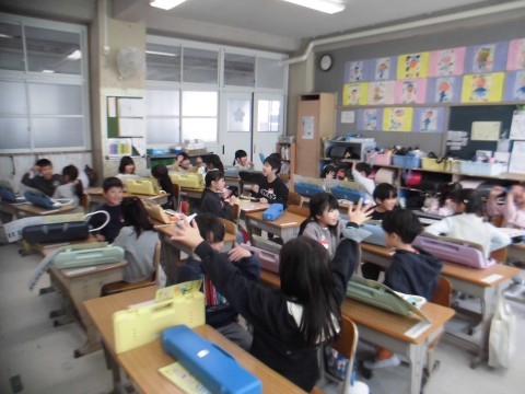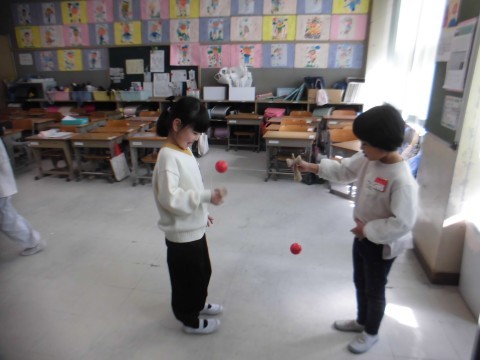 休み時間には,コマまわしとけん玉が流行っています。こままわしは手のせならぬ,下敷き乗せに挑戦に挑戦しています。