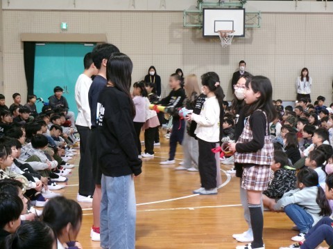 今年度,全校児童が集まる最後の機会,6年生への「卒業おめでとう!」下級生への「これからもがんばってね!」というお互いの気持ちがあふれるとても素敵な会でした。