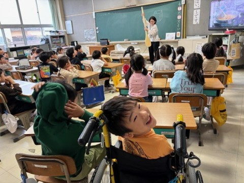 食事の前には、栄養教諭の先生から給食についてのお話を聞きました。先生が給食室で実際に使っている「大きなしゃもじ」を取り出すと、子どもたちからは「うわあ!」「大きい!」と大きな歓声が上がりました。